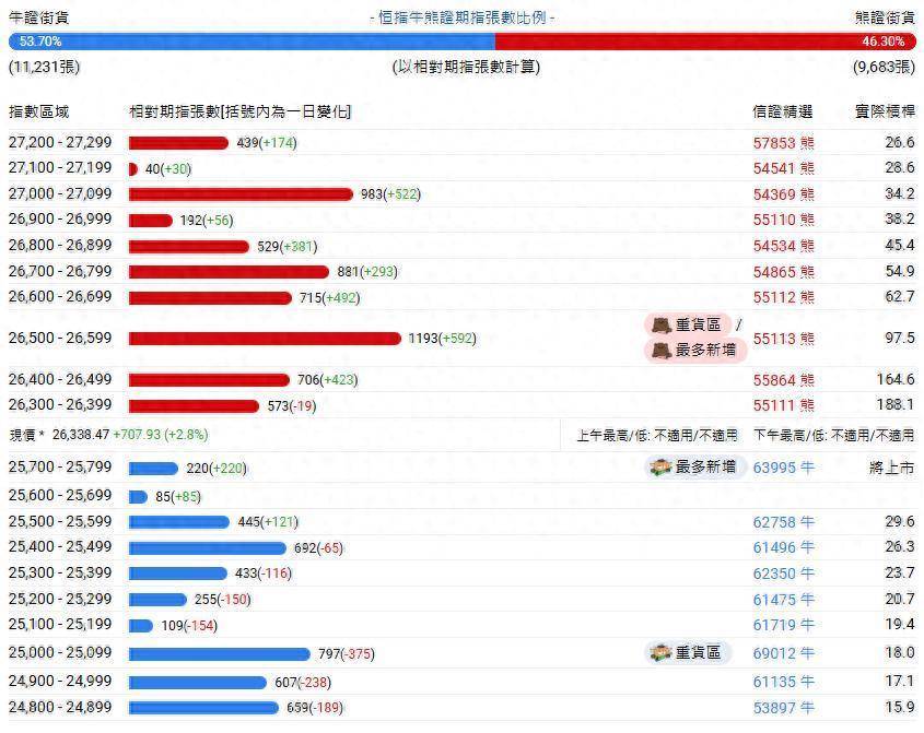 中信证券牛熊证街货分布图中的数据显示,熊证街货重货区与最多新增均在26500-26599区间,该区间最新熊证数量为1139张,较上一交易日增加592张。